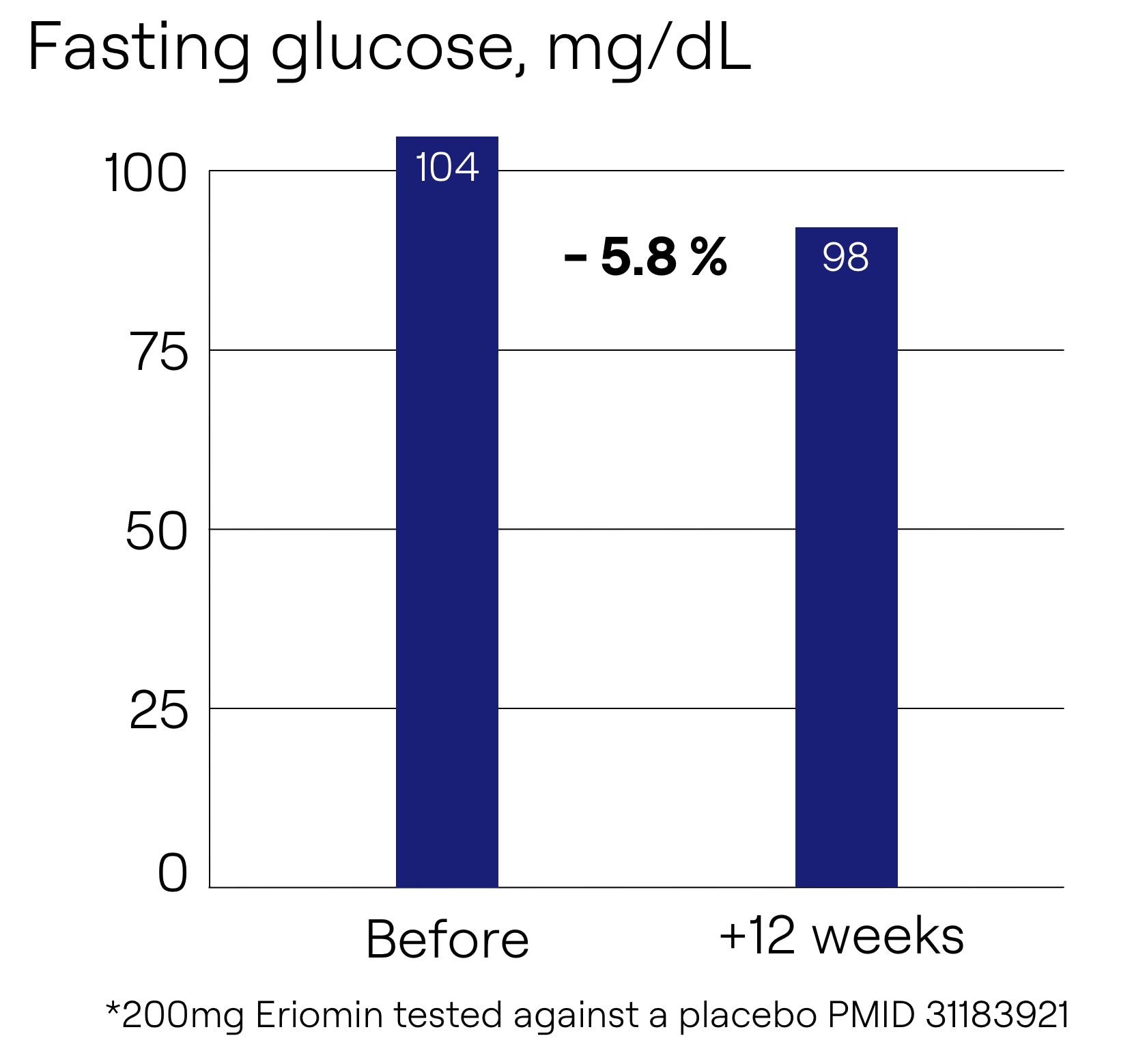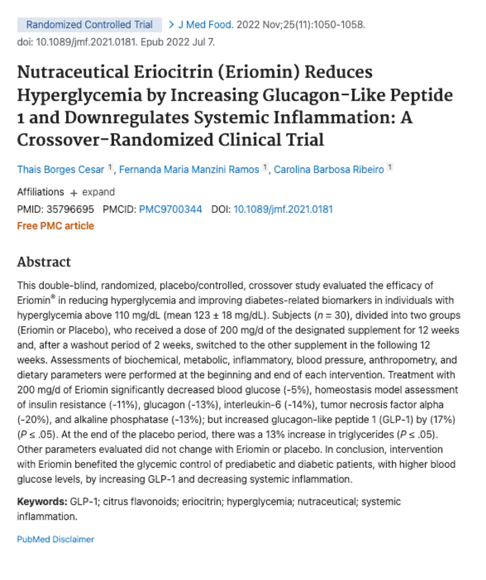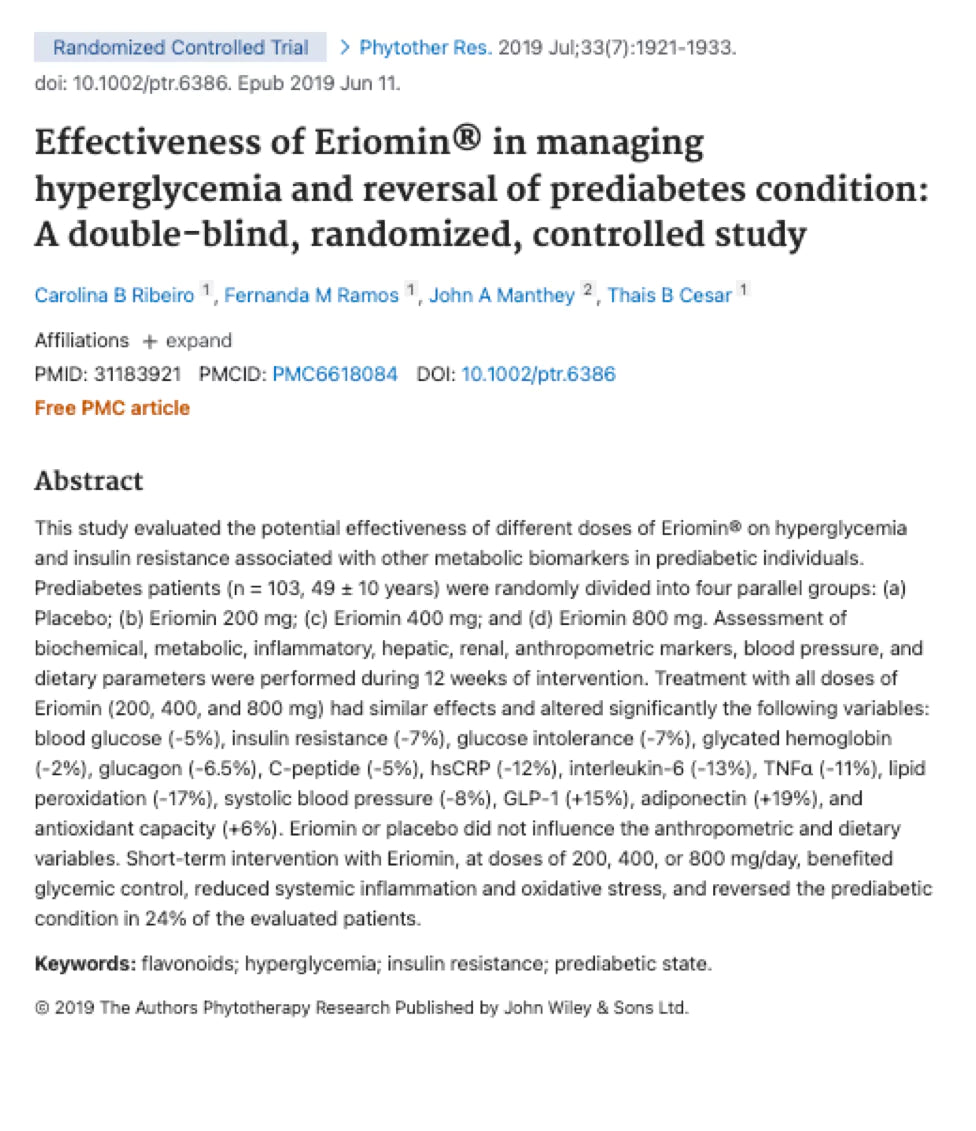 Double-blind, randomized, placebo-controlled crossover study on Eriomin® reducing hyperglycemia in individuals with prediabetes, 30 participants.