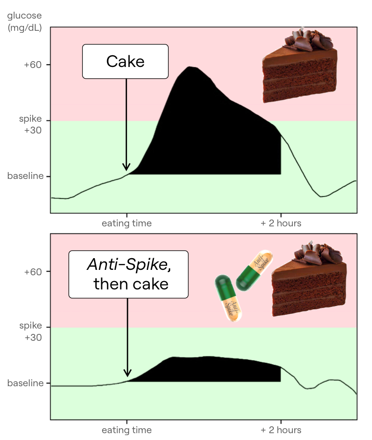 • Graph on the effect of Anti-spike on glucose spikes after cake