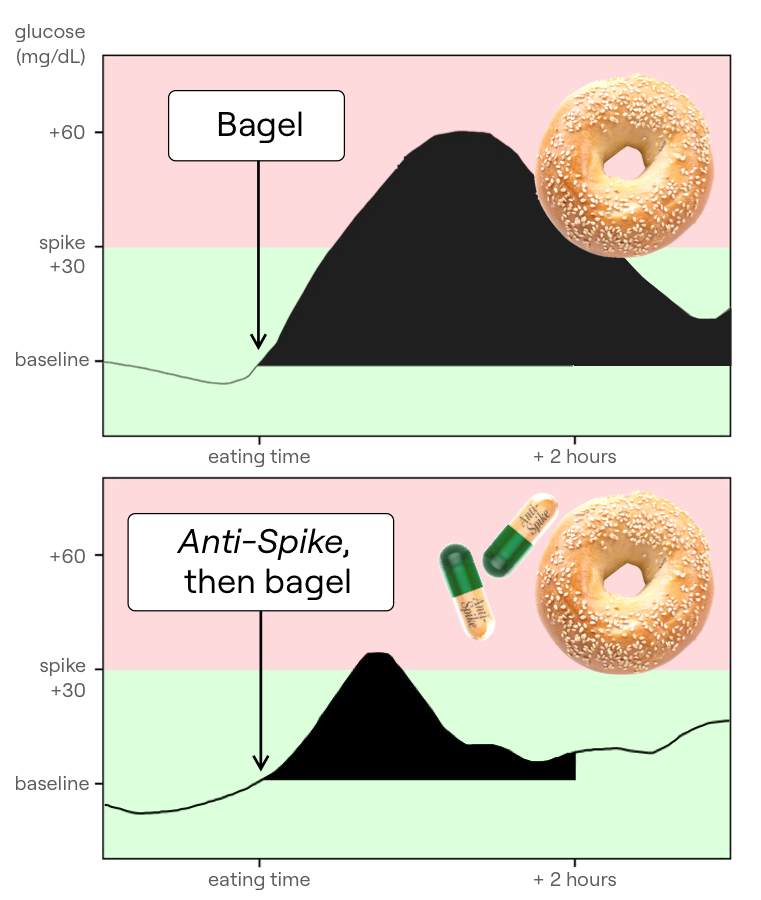 • Graph on the effect of Anti-spike on glucose spikes after a bagel