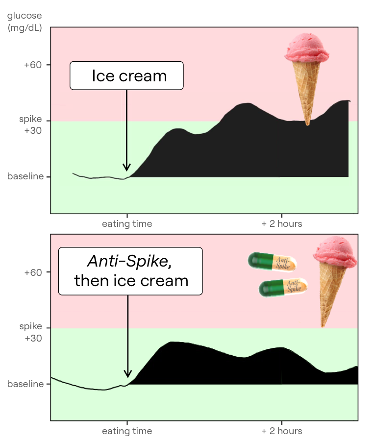 • Graph on the effect of Anti-spike on glucose spikes after ice cream