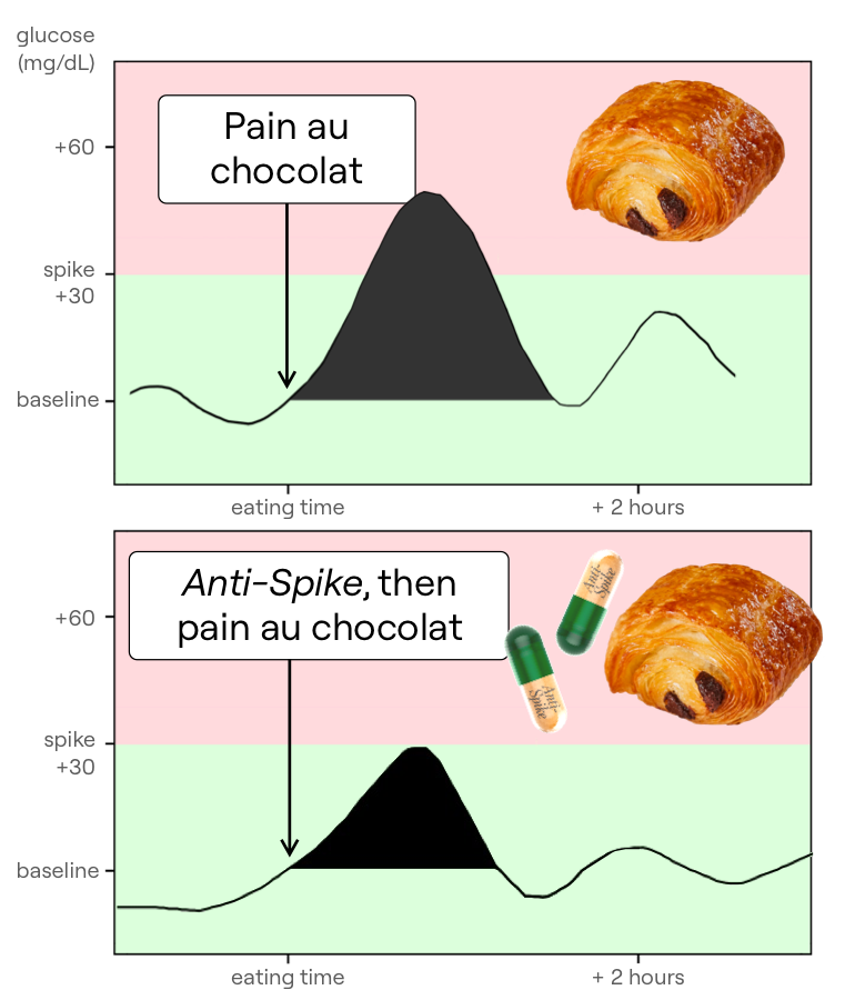 • Graph on the effect of Anti-spike on glucose spikes after pain au chocolat