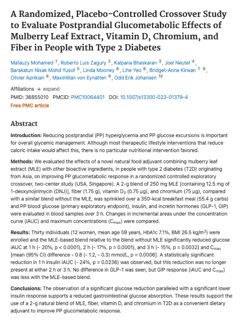 Randomized placebo-controlled crossover study, on the effects of Mulberry leaf extract in people with type 2 diabetes, 30 participants.