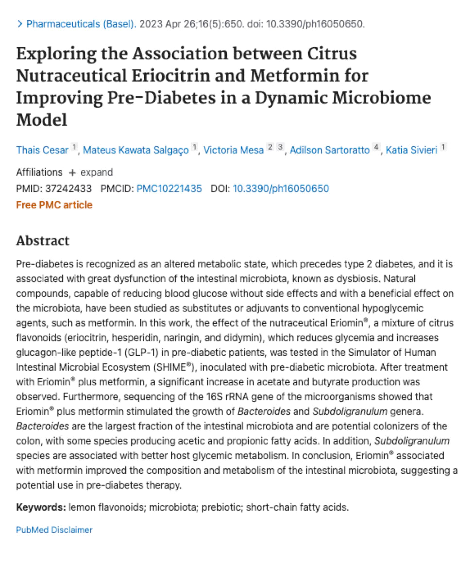 Study in a dynamic microbiome model on the combination of the nutraceutical Eriomin® and a medication commonly used for diabetes for improving pre-diabetes.
