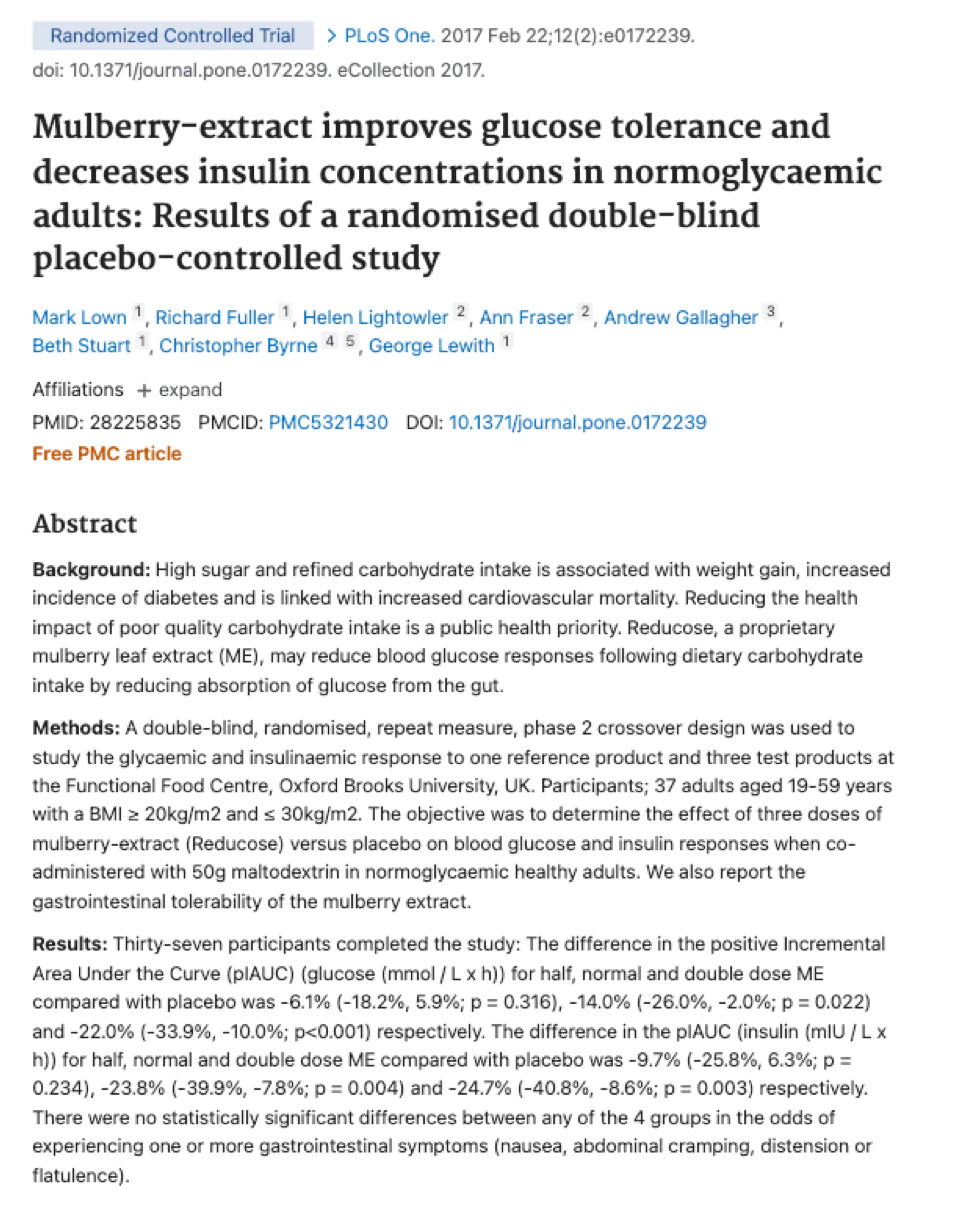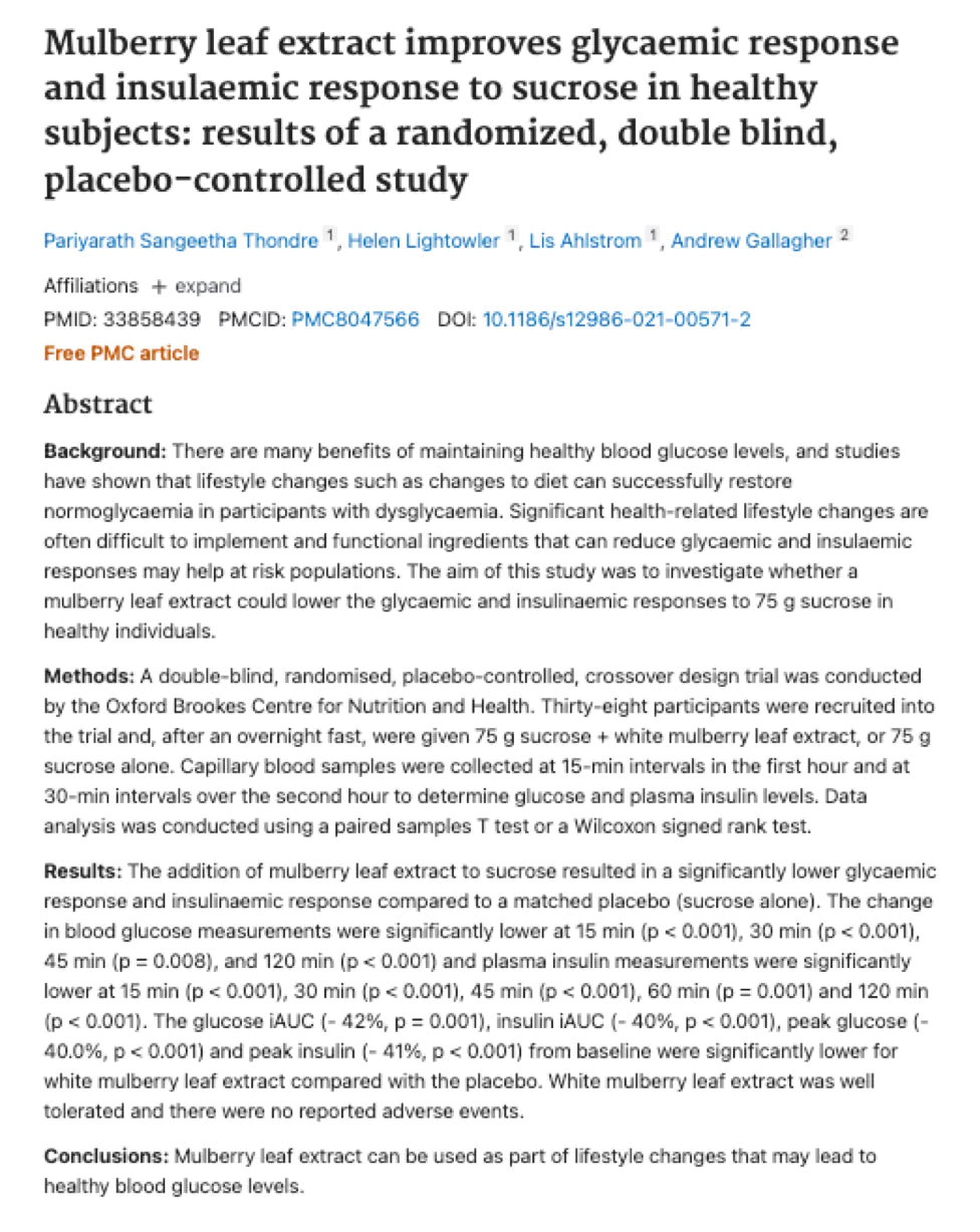Randomized double-blind placebo-controlled study on the effect of Mulberry leaf extract on glucose and insulin responses in healthy subjects, 38 participants.