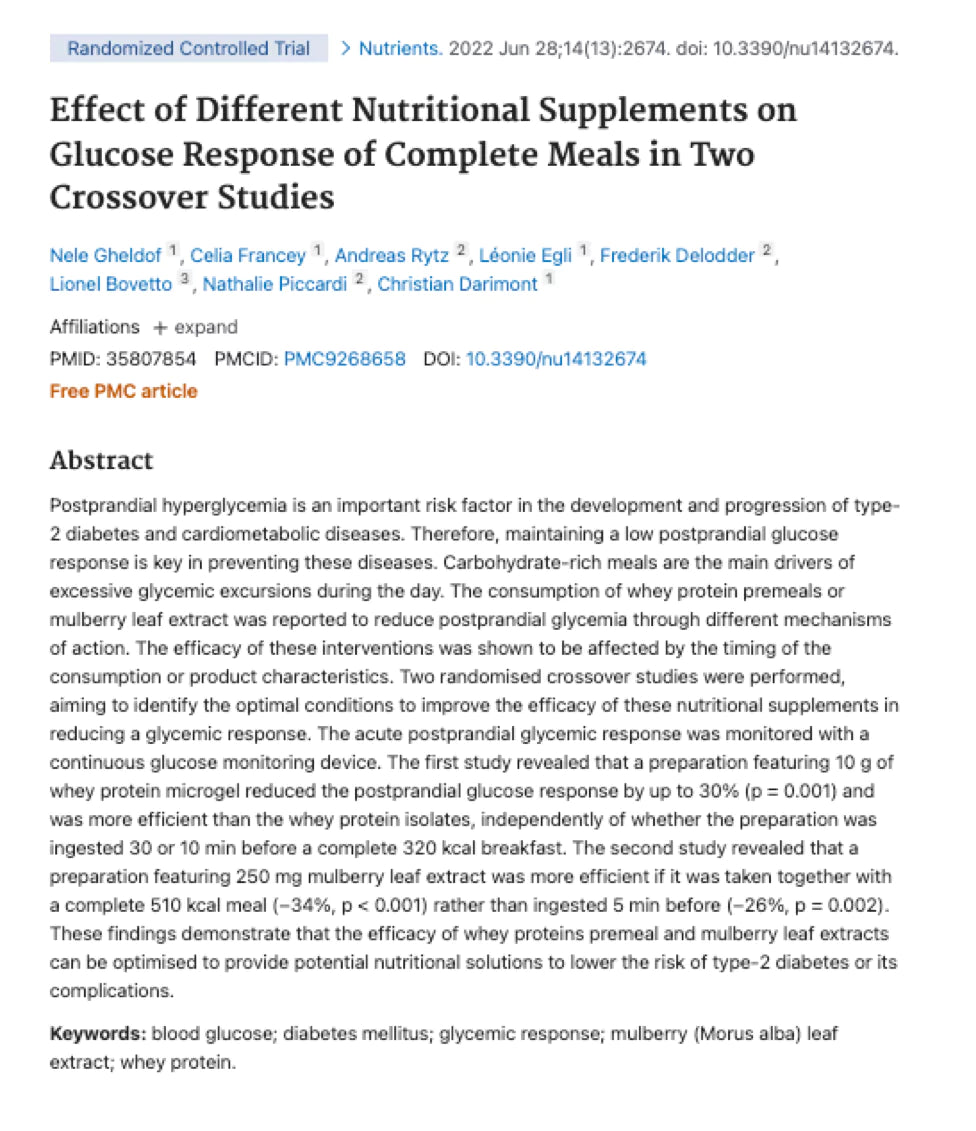 Two randomized crossover studies on the effect of whey protein and Mulberry leaf extract on postprandial glycemia.