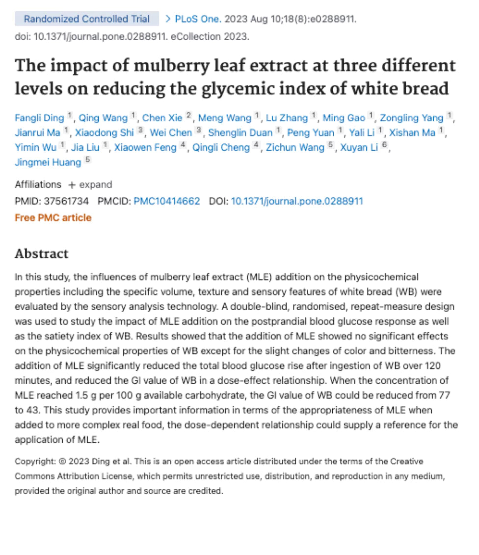 The addition of mulberry leaf extract significantly reduced the total blood glucose rise after ingestion of white bread over 120 minutes, and reduced the GI value of white bread in a dose-effect relationship.
