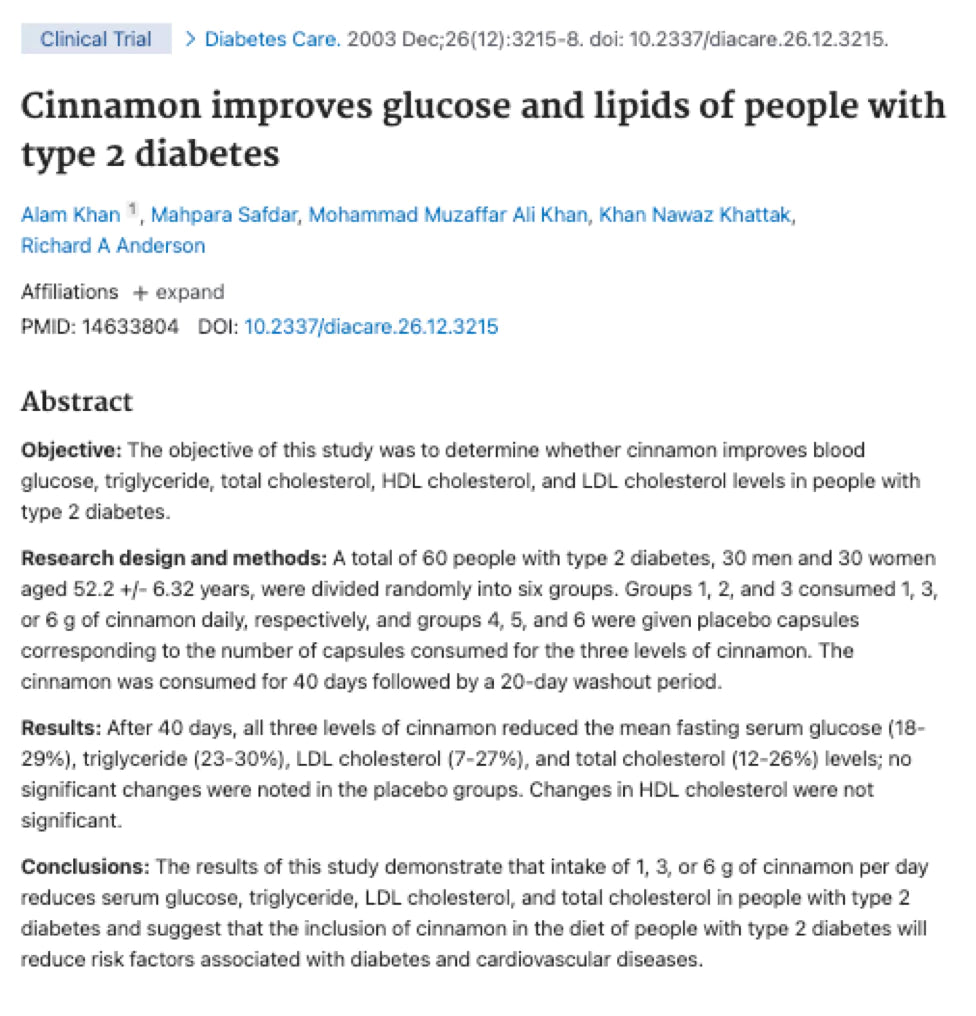 After 40 days, all three levels of cinnamon reduced the mean fasting serum glucose (18-29%); [...] no significant changes were noted in the placebo groups.