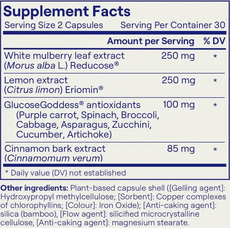 White mulberry leaf (Reducose®, 250mg) contains DNJ, an alpha-glucosidase inhibitor which lets sugar molecules of your meal pass through to your microbiome without being absorbed into your bloodstream. This leads to a 40% reduction in the glucose spike of the meal.